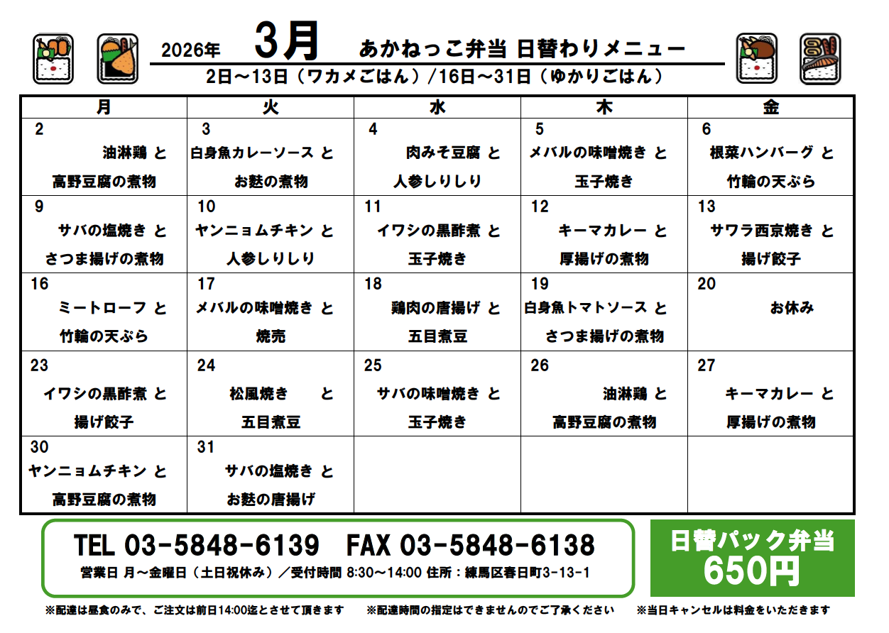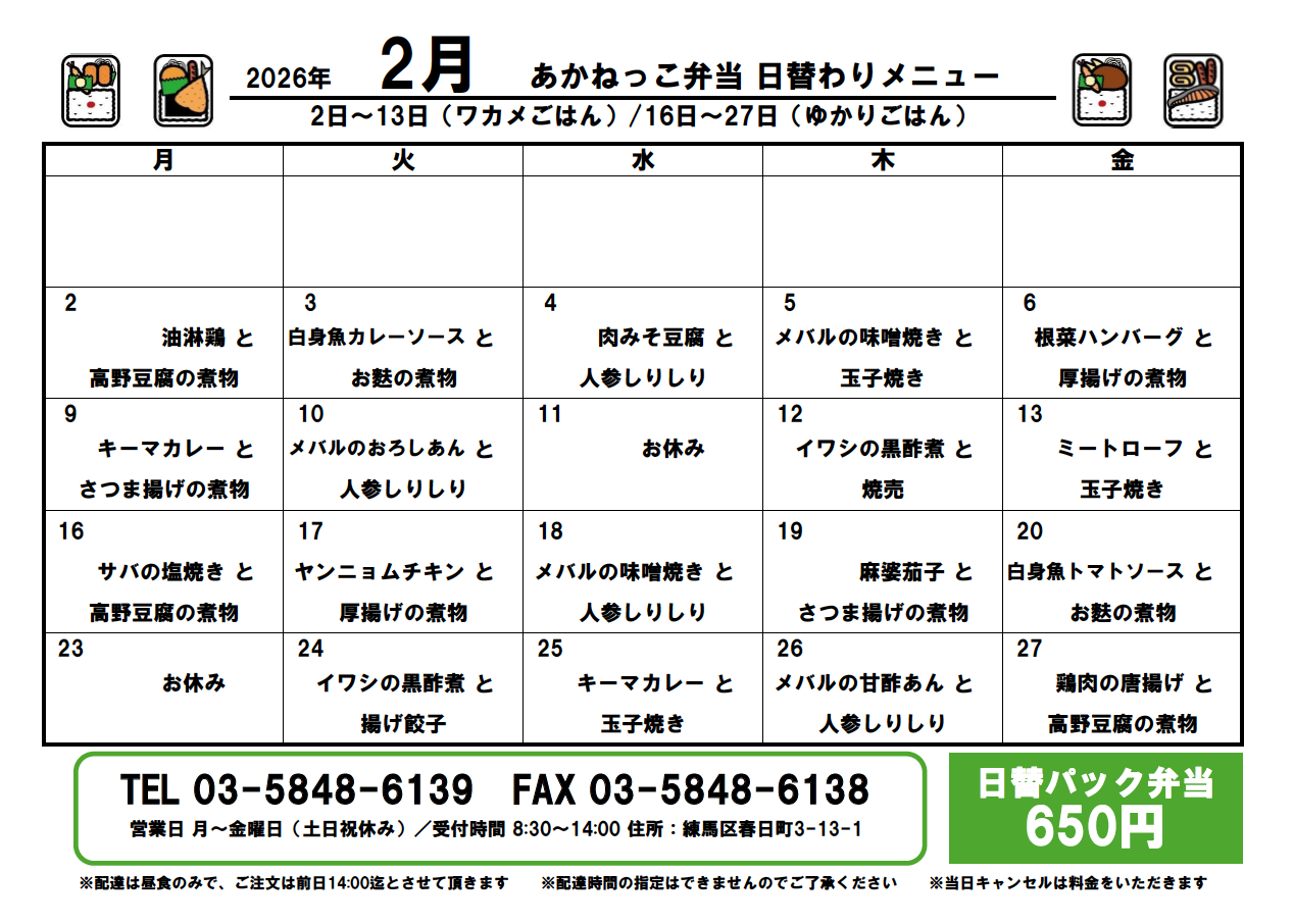 ◆日替わり弁当(パック)650円(配送料込み)