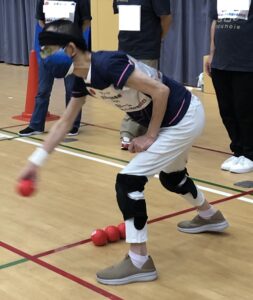 日常的に、練習している成果は大きいと思います。支援員のアドバイスを聞いて、しっかり、目標の白いボールを狙って、何回も手を持ったボールを振りながら、狙いを定め投げていました。方向も大事ですが、投げる力加減によっては、遠くまで飛びすぎて、赤いラインを超えてしまうと失格です。弱すぎても、白いボールのあるところまで行きません。